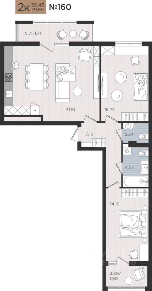 Продаётся 2-комнатная квартира в строящемся доме (Дом 4), срок сдачи: I-кв. 2027, общей площадью 79.59 кв.м., на 3 этаже. Новые жилые дома от Специализированного застройщика ''Самолет Калининград Плюс'' расположены в г. Калининград на ул. Советский проспект.