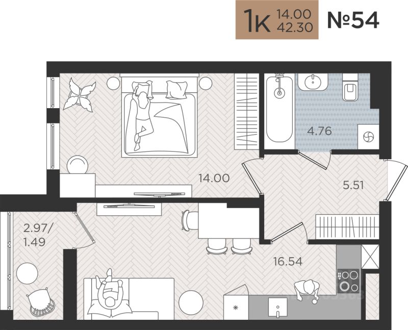 Продаётся 1-комнатная квартира в строящемся доме (Дом 3), срок сдачи: III-кв. 2026, общей площадью 42.3 кв.м., на 5 этаже. Новые жилые дома от Специализированного застройщика ''Самолет Калининград Плюс'' расположены в г. Калининград на ул. Советский проспект.