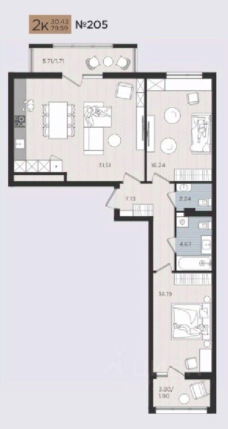 Продаётся 2-комнатная квартира в строящемся доме (Дом 3), срок сдачи: III-кв. 2026, общей площадью 79.59 кв.м., на 4 этаже. Новые жилые дома от Специализированного застройщика ''Самолет Калининград Плюс'' расположены в г. Калининград на ул. Советский проспект.