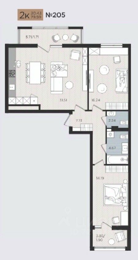 Продаётся 2-комнатная квартира в строящемся доме (Дом 3), срок сдачи: III-кв. 2026, общей площадью 79.59 кв.м., на 2 этаже. Новые жилые дома от Специализированного застройщика ''Самолет Калининград Плюс'' расположены в г. Калининград на ул. Советский проспект.