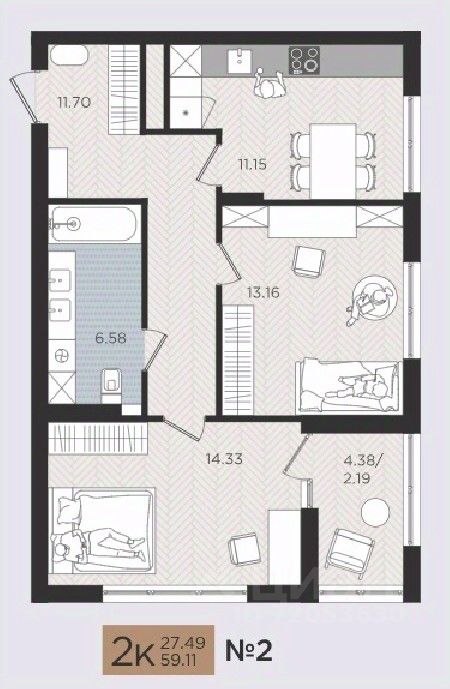 Продаётся 2-комнатная квартира в строящемся доме (Дом 3), срок сдачи: III-кв. 2026, общей площадью 59.11 кв.м., на 2 этаже. Новые жилые дома от Специализированного застройщика ''Самолет Калининград Плюс'' расположены в г. Калининград на ул. Советский проспект.