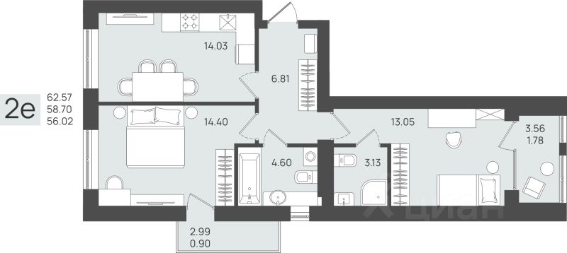 Общая площадь58,7 м2