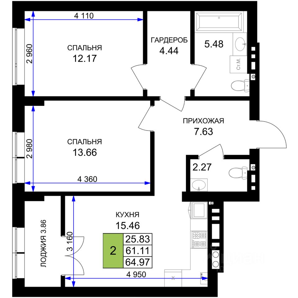 Продаётся 2-комнатная квартира в строящемся доме (Дом 7 (2 очередь)), срок сдачи: I-кв. 2027, общей площадью 64.97 кв.м., на 3 этаже. Новый жилой комплекс ''Включи'' от застройщика ''СпецСтройКубань'' расположен в г. Гурьевск в районе Гурьевского шоссе.