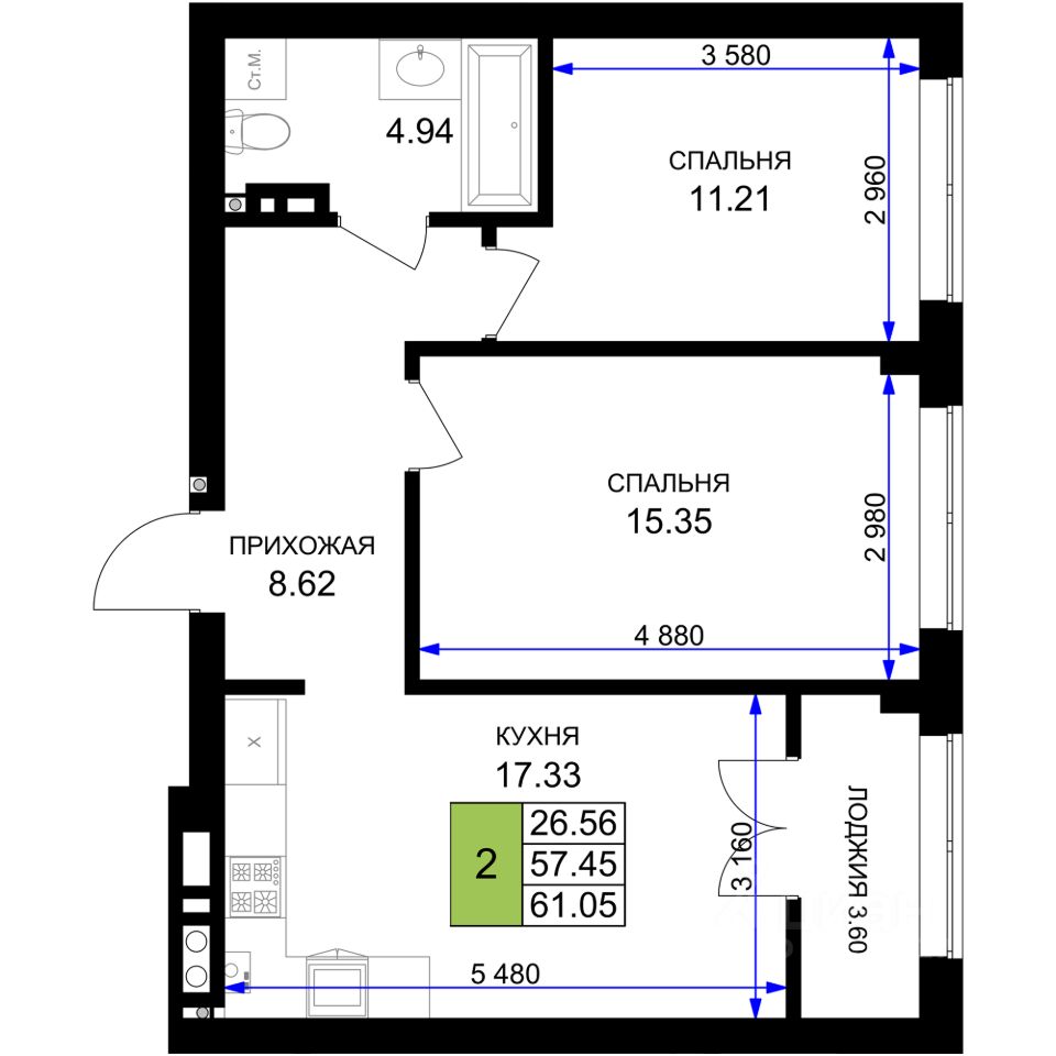 Продаётся 2-комнатная квартира в строящемся доме (Дом 6 (2 очередь)), срок сдачи: I-кв. 2027, общей площадью 61.05 кв.м., на 3 этаже. Новый жилой комплекс ''Включи'' от застройщика ''СпецСтройКубань'' расположен в г. Гурьевск в районе Гурьевского шоссе.