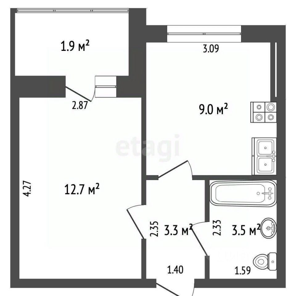 Общая площадь составляет 30 м2 -Прихожая 3,3 м2 -Кухня 9 м2 -Жилая комната 12,7 м2 -Лоджия 2 м2 -Санузел 3,5 м2