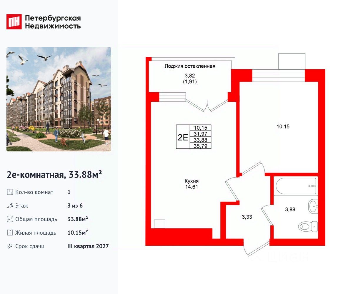 Удобная, классическая, функциональная европланировка, большая кухня-гостиная 14.61 м², вместительная прихожая 3.33 м². Общая площадь квартиры - 33.88 м², жилая 10.15 м², высота потолка 3 м.
