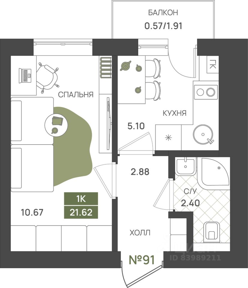 Общая площадь21,62 м2