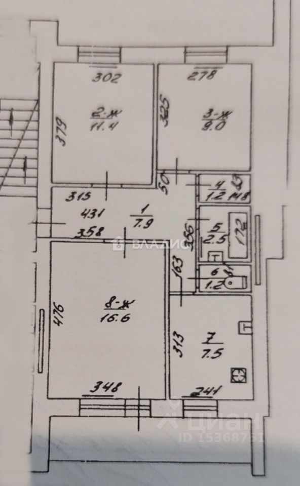 Общая площадь жилья составляет 57,3 квадратных метра. Она включает: спальни площадью 16,6 кв.м., 11,4 кв.м. и 9 кв.м., ванную комнату- 2,5 кв.м, санузел - 1,2 кв.м, кухню - 7,5 кв.м, просторную лоджию - 5 кв.м, коридор - 7,9 кв.