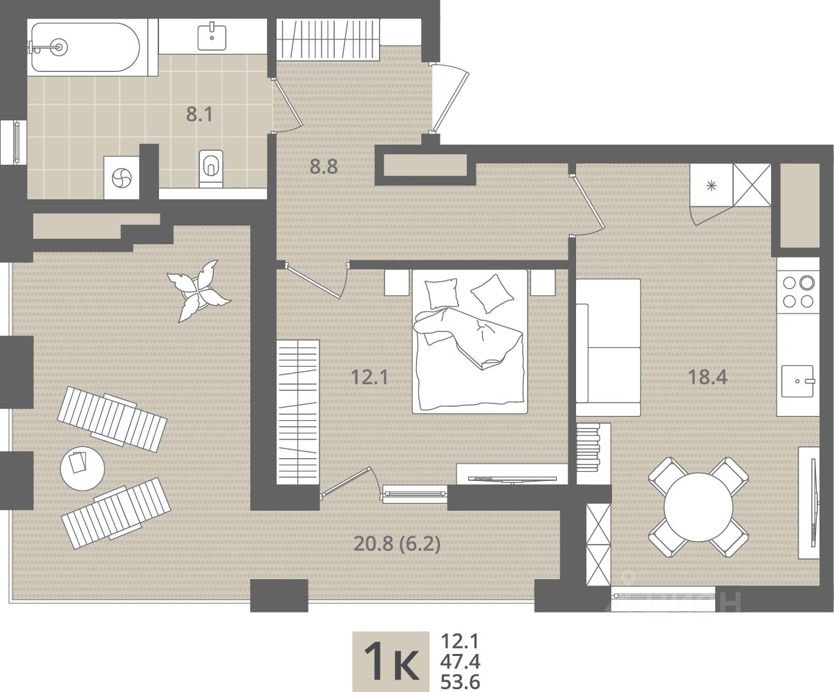 Продаётся 1-комнатная квартира в строящемся доме (Дом 1.2), срок сдачи: IV-кв. 2026, общей площадью 53.6 кв.м., на 7 этаже. Новый жилой комплекс ''МОре'' от Строительной компании ''Меркурий'' расположен по адресу: Калининградская область, г. Пионерский, пос. Рыбное.