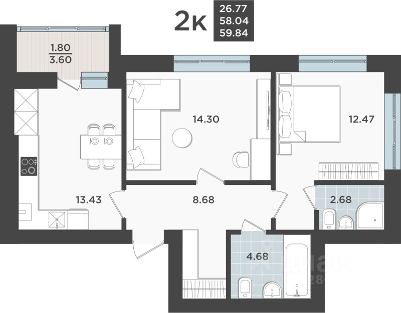 Общая площадь58,04 м2