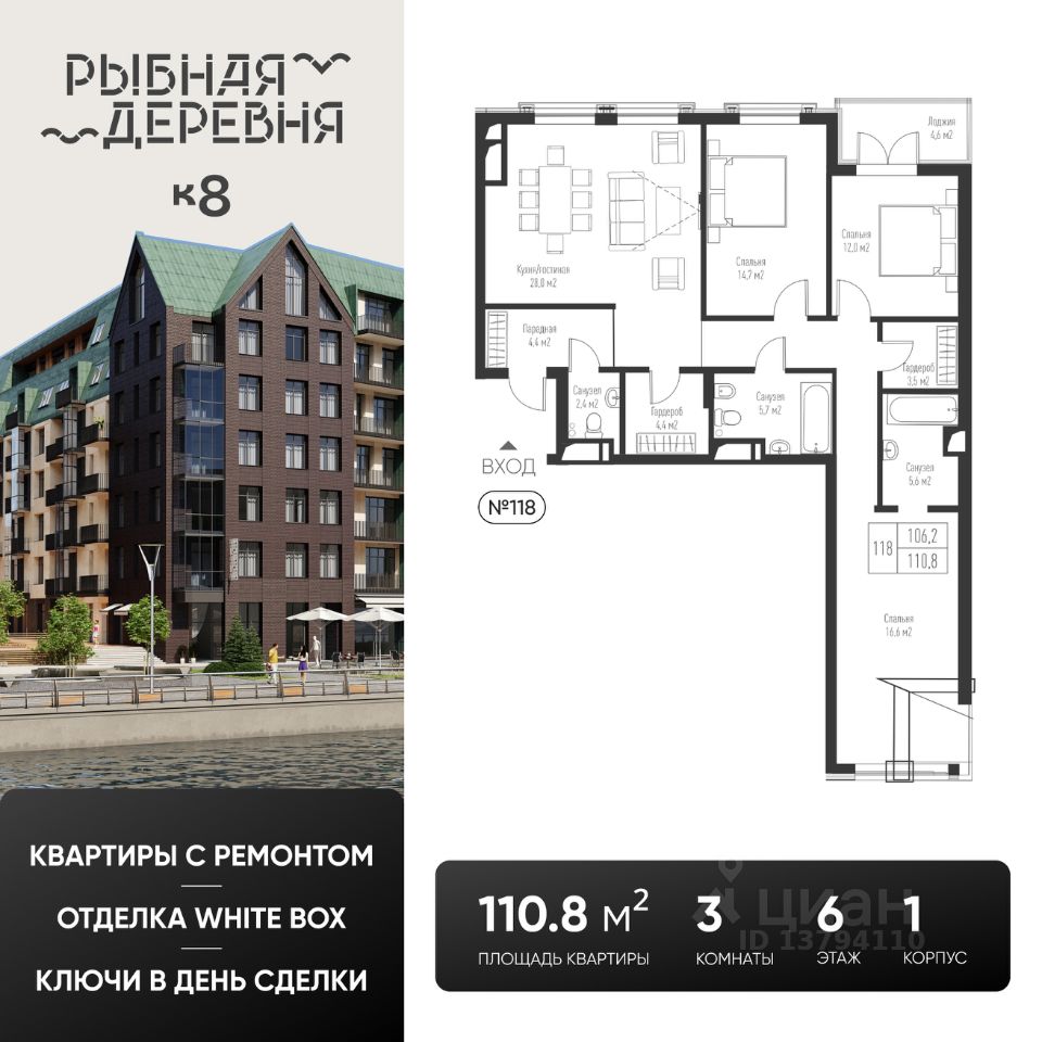 При 100% оплате за собственные средства (или ипотека без субсидирования), а также при рассрочке в зависимости от размера первоначального взноса и срока предоставляется СКИДКА! Жилой комплекс Рыбная деревня находится в самом сердце Калининграда. Его месторасположение бесспорно является одним из лучших в городе: удобная транспортная развязка, качественное инфраструктурное окружение, близость к центру, многочисленные кафе и рестораны, интересные прогулочные маршруты, роскошные виды. Для максимального комфорта жильцов в квартирах продуманы все детали - гардеробные, кухни - столовые, гостевые санузлы, мастер спальни, панорамное остекление.