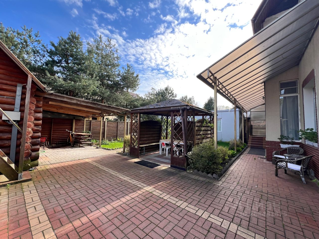 На территории: баня на дровах, беседки, печка/мангал , место для автомобилей под крышей, терраса с уличной мебелью, песочница, сад, двухкомнатная пристройка, дровница, очистные.